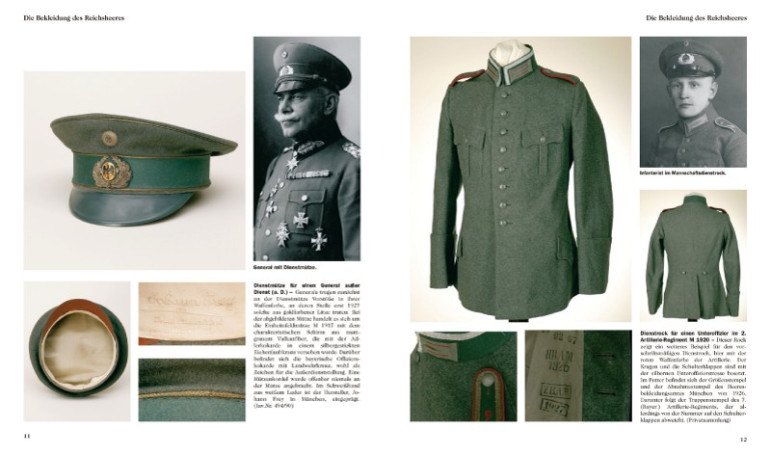 Tous les vêtements sont montrés au lecteur dans des photographies aux couleurs éclatantes. À cette fin, les objets conservés au Bayerisches Armeemuseum ont été utilisés pour la première fois, les archives contenant une impressionnante collection d'échantillons originaux. Des ajouts sont apportés par des objets importants du Wehrgeschichtliches Museum de Rastatt et de collections privées. Des photographies contemporaines en noir et blanc montrent la manière dont les objets ont été portés ou transportés. Souvent, les photographies montrent des officiers qui allaient acquérir une renommée militaire des années plus tard au cours de la Seconde Guerre mondiale.