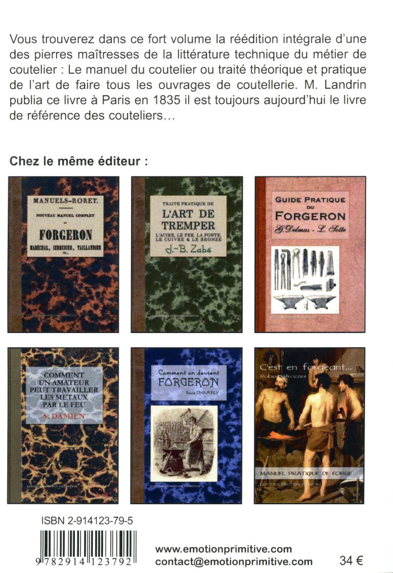 Vous trouverez dans ce fort volume de 464 pages la réédition intégrale d'une des pierres maîtresses de la littérature technique du métier de coutelier : Le manuel du coutelier ou traité théorique et pratique de l'art de faire tous les ouvrages de coutellerie. M. Laudrin publia ce livre à Paris en 1835 il est toujours aujourd'hui le livre de référence des couteliers- Illustré de plus de 100 schémas en 11 planches en fin d'ouvrage.