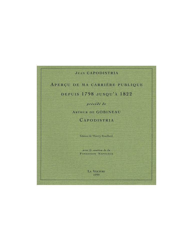 Jean Capodistria fut diplomate au service de la Russie de 1798 à 1820. Premier président de la Grèce en 1827, il fut assassiné en 1831. Dans cet écrit il livre ses impressions de diplomate, témoignant sur l'activité diplomatique de cette période mouvementée de l'Histoire. Précédé par un texte d'Arthur de Gobineau sur ce personnage historique.