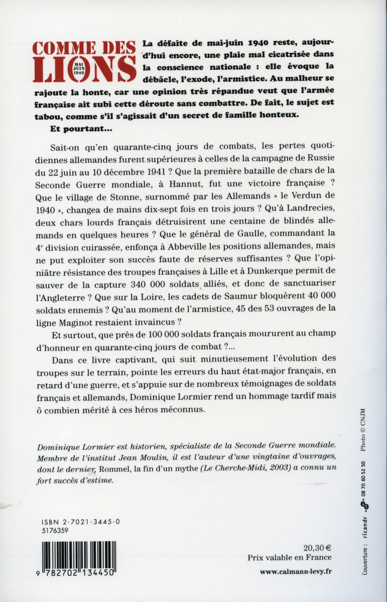 Dans ce livre captivant, qui suit minutieusement l'évolution des troupes sur le terrain, pointe les erreurs du commandement français et s'appuie sur de nombreux témoignages, Dominique Lormier rend un hommage tardif mais ô combien mérité à ces héros méconnus.