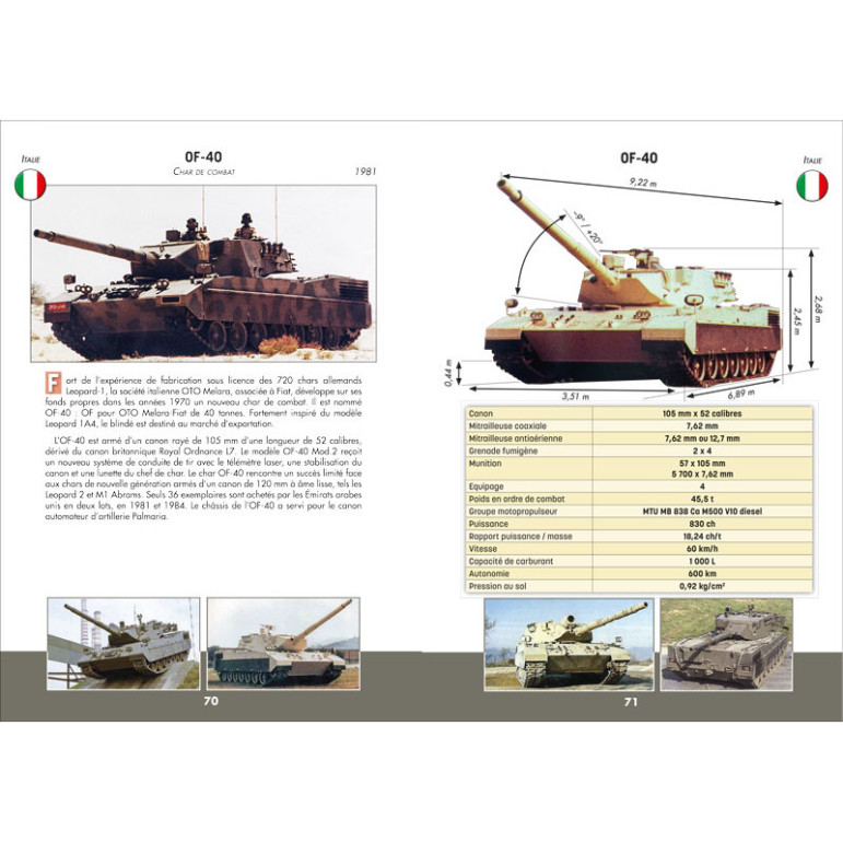 Le livre définit clairement les générations des chars de combat actuellement en service. Riche de plus de 350 photographies, méthodique, il révèle l'historique de chaque char avec des dates précises et présente les capacités et les caractéristiques techniques des différents modèles. Les dimensions sont indiquées d'une manière pratique et visuelle.