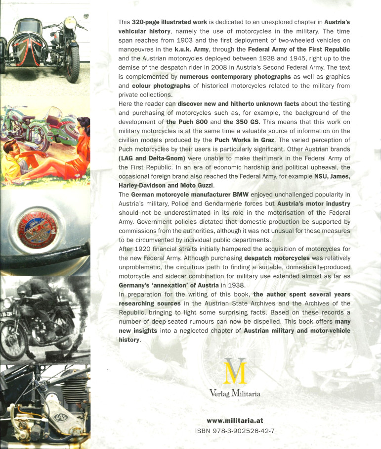 Le livre est consacré à un chapitre inexploré dans l'histoire "automobile" de l'Autriche, à savoir l'utilisation de motos dans l'armée. Il commence en 1903 par le premier déploiement de véhicules à deux roues sur des manœuvres dans le k.u.k.