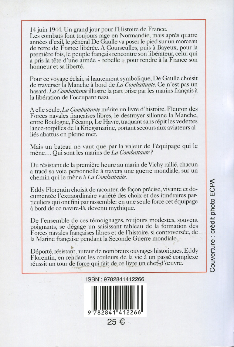 Qui sont les marins de La Combattante ? Du résistant de la première heure au marin de Vichy rallié, chacun a tracé sa voie personnelle à travers une guerre mondiale, sur un chemin qui le mène à La Combattante. Eddy Florentin choisit de raconter, de façon précise, vivante et documentée l'extraordinaire variété des choix et des itinéraires particuliers qui ont fini par rassembler en une seule force cet équipage à bord de ce navire-là, devenu mythique.