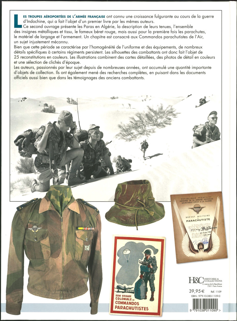 Les troupes aéroportées de l’armée française ont connu une croissance fulgurante au cours de la guerre d’Indochine, qui a fait l’objet d’un premier livre par les mêmes auteurs. Ce second ouvrage présente les Paras en Algérie, la description de leurs tenues, l’ensemble des insignes métalliques et tissu, le fameux béret rouge, mais aussi pour la première fois les parachutes, le matériel de largage et l’armement. Un chapitre est consacré aux Commandos parachutistes de l’Air, un sujet injustement méconnu.