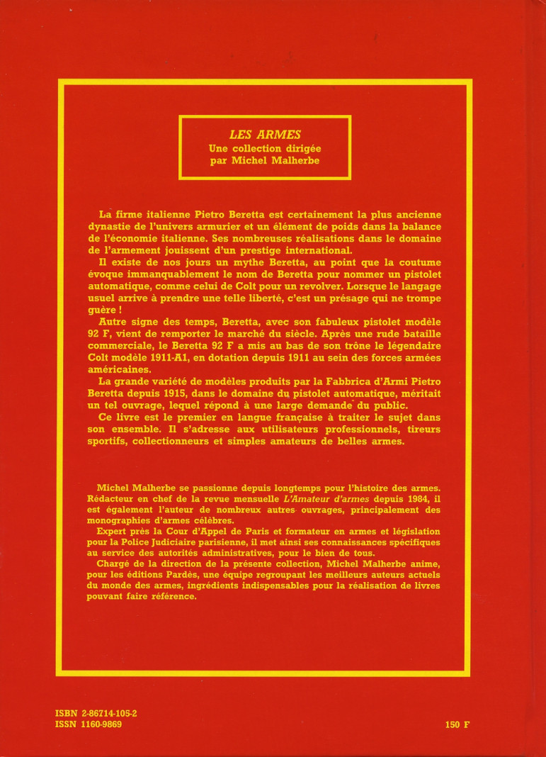 Dans "Les Pistolets Beretta", Michel Malherbe détaille avec précision comment la firme a su se démarquer par ses innovations, notamment avec le fameux modèle 92 F. Ce pistolet au design et à la performance révolutionnaires, a réussi à détrôner le légendaire Colt modèle 1911-A1 des forces armées américaines après une rude bataille commerciale. Le livre vous offre un aperçu technique et historique des différentes gammes produites depuis 1915, soulignant la capacité de Beretta à se réinventer et à imposer de nouveaux standards. Chaque modèle est présenté avec un souci du détail, illustrant non seulement l'évolution technique des pistolets automatiques, mais aussi l'engagement de Beretta envers l'excellence et l'innovation.